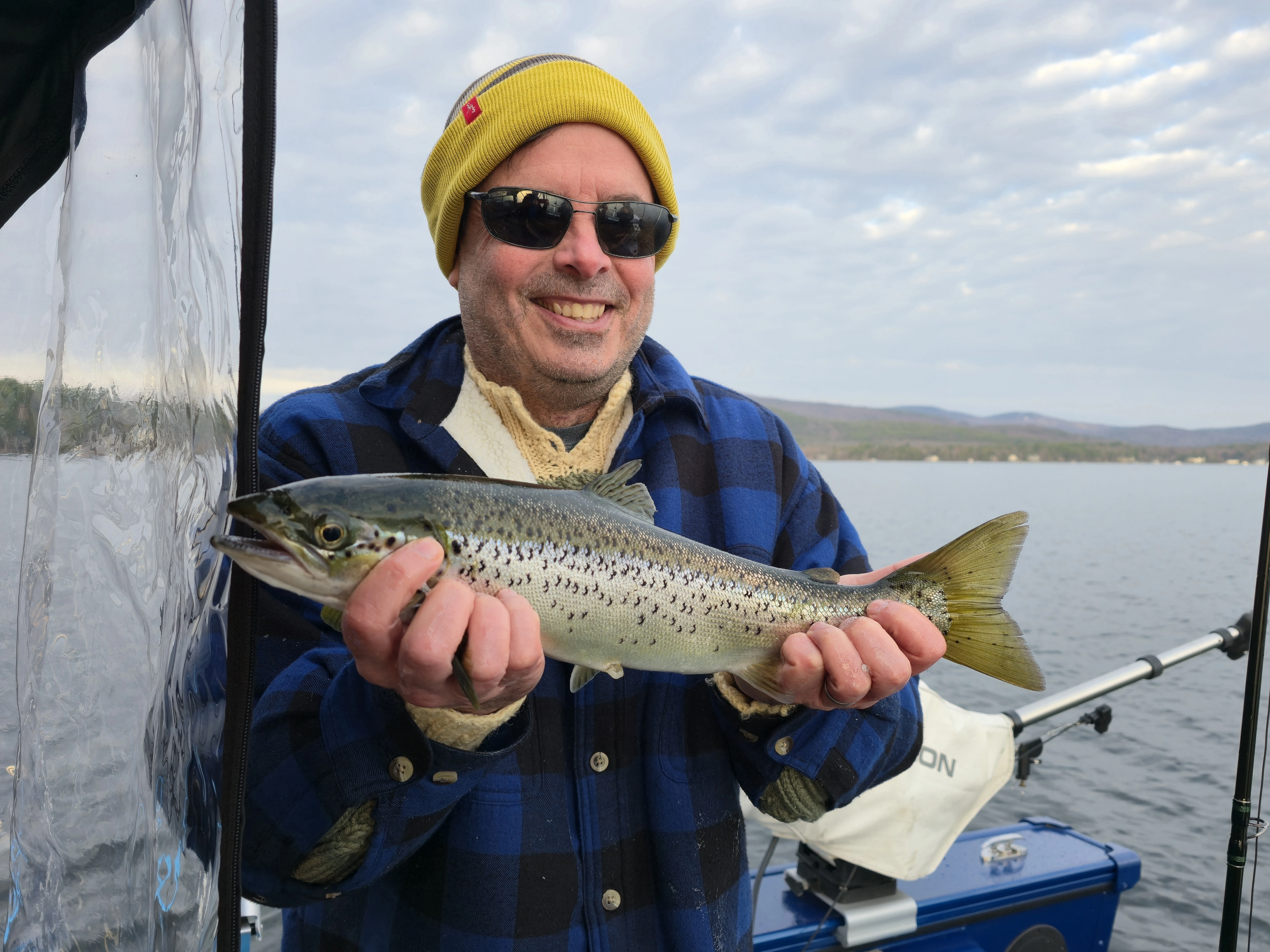 Tim from Tim Moore Outdoors/Lake Winnipesaukee Fishing Guide Service on Lake Winnipesaukee was happy to have his boat in and running trips again. “First off, thank you to everyone for coming out to my seminar at KTP on Saturday, and to KTP for having me. The boat is at the dock and it was a busy week. The week started out great, but the cold snap that moved in slowed things down. All of my clients caught fish, but things were noticeably slower lake-wide. I’m still trolling sewn smelt at 1mph down 5’-10’ on sinking fly line or one color of lead core. I keep hearing complaints about skinny salmon, but almost everyone we have caught has been plump and healthy-looking. Water temps should increase a bit over the next couple of days and then rain and cool overnight temps later in the week will stabilize temps. The coming full moon and midge hatches are going to throw a wrench in the works and slow the fishing down. I hope I’m wrong,” he said.