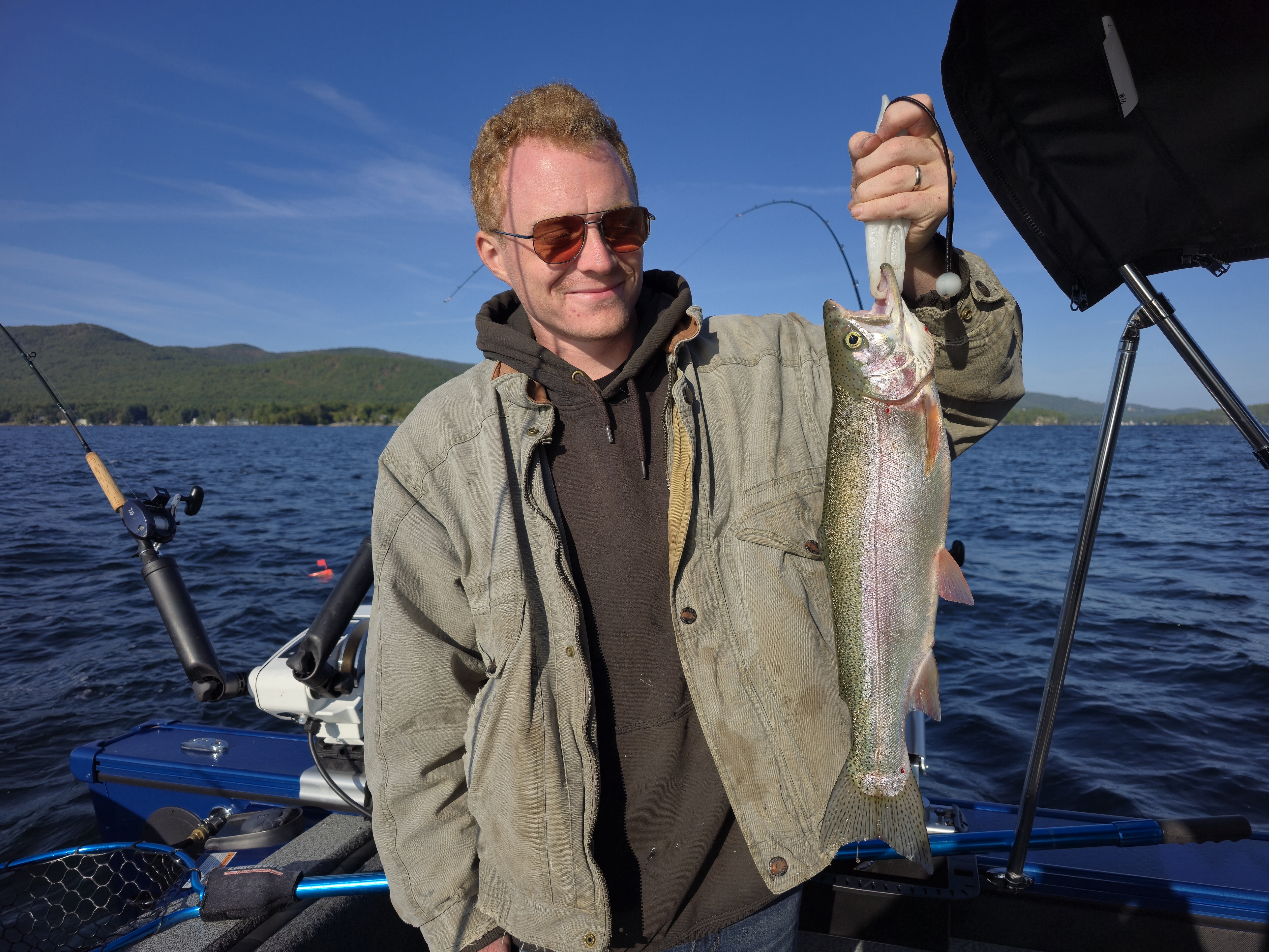 Tim from Tim Moore Outdoors/Lake Winnipesaukee Fishing Guide Service on Lake Winnipesaukee reported a serious upswing in the fishing, after a few rough days during the full moon. “Man, the recent full moon last week was rough for fishing on Lake Winnipesaukee. All you heard were anglers’ struggles. Then, Thursday morning it did a complete 180 and lit up. It has been on fire ever since. We landed three rainbows one morning that were all over 4-pounds with a few salmon mixed in. AJ’s Blood and Guts Tommy Gun Spoon has still been my hot spoon, but with the fish targeting young of the year smelt, single hook streamer flies with yellow or orange have been leading by far. The fish are still down 30-feet, and the water temp is still around 68-degrees. Two more weekends left for me before the season ends and I make the switch to crappies,” he said.